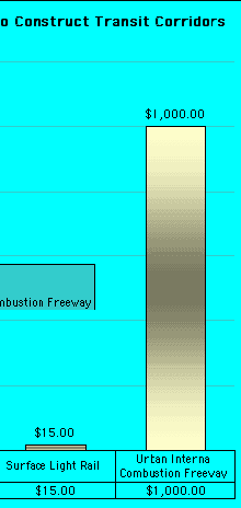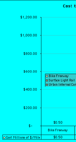 Estimated cost to construct one mile of bike freeway, light rail, and internal combustion freeway (in millions of dollars)